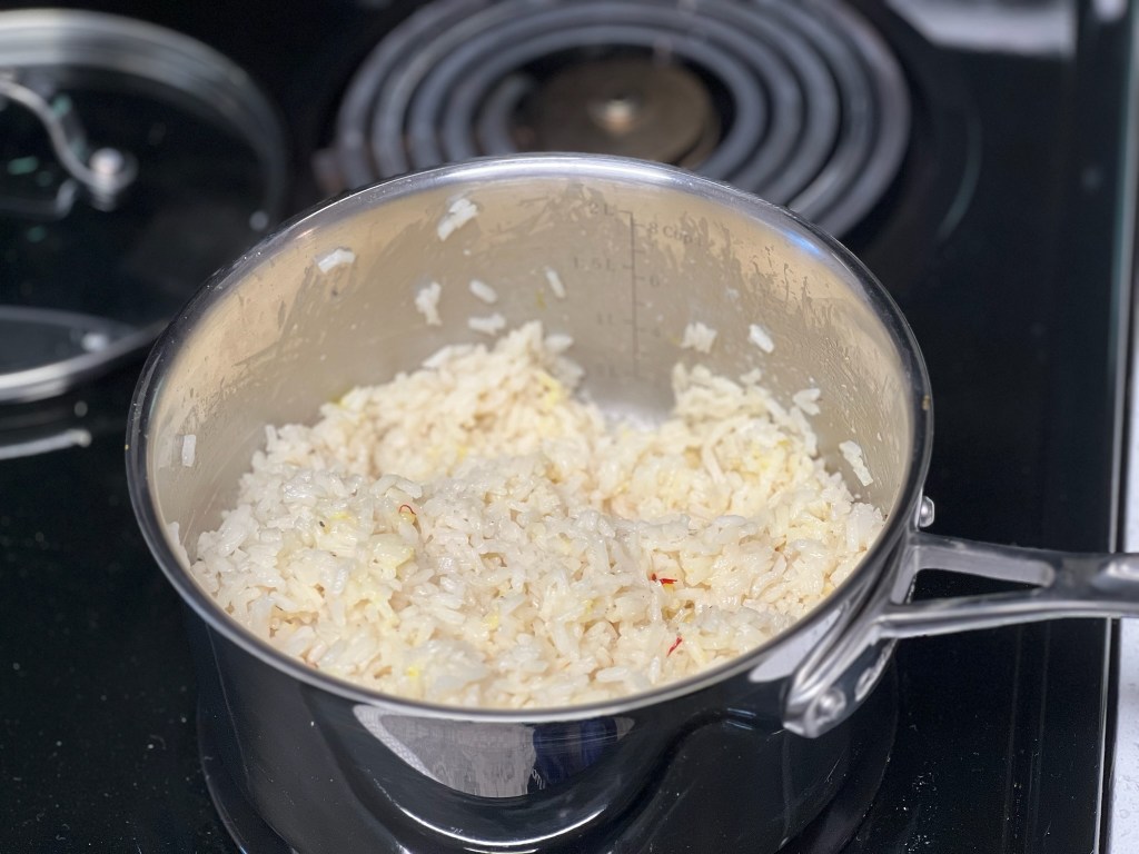 - Once the rice is cooked, stir in the saffron threads and butter until fully melted and incorporated.