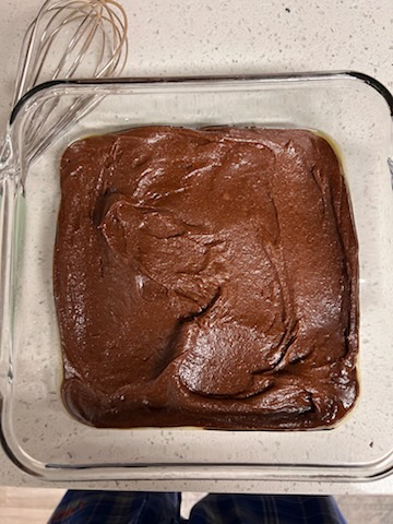 Pour the batter into a greased 8×8-inch baking pan and smooth the top. Bake at 350°F for 25 to 30 minutes, or until a toothpick inserted in the center comes out with just a few moist crumbs.