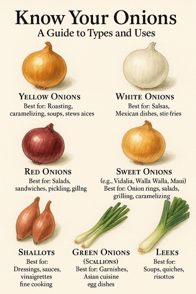 Yellow for everyday cooking, white for spice-forward dishes, red for raw crunch, sweet for a mellow bite, shallots for elegance, green onions for freshness, and leeks for a touch of sweetness. Master these, and you’ll have a handle on the flavorful world of onions.